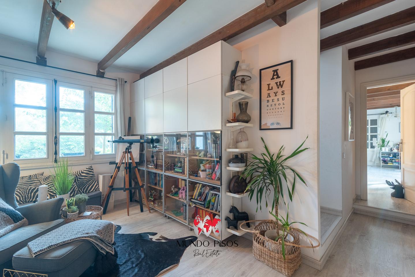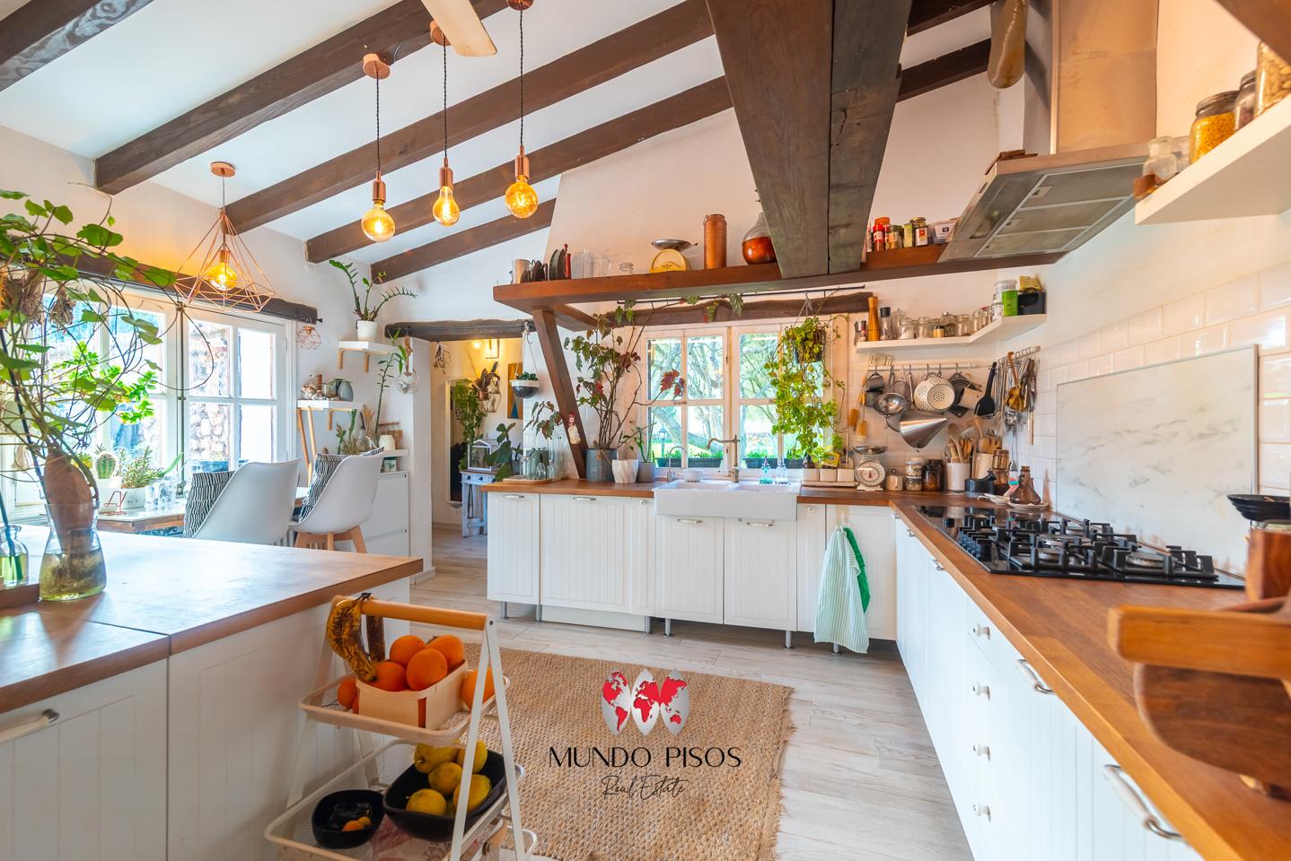 Es una casa luminosa y pensada para disfrutarla. En la planta baja, la estancia principal es un gran salón acristalado con vistas totalmente despejadas a la piscina y a los jardines. Pura luz y silencio. De ahí pasamos a la cocina-comedor de muy buenas dimensiones, luminosa y con mucho carácter, con acceso a una coladuría independiente y una despensa. Se completa con una salita transformable en dormitorio, un dormitorio habilitado como tal con zona de vestidor y un baño completo.